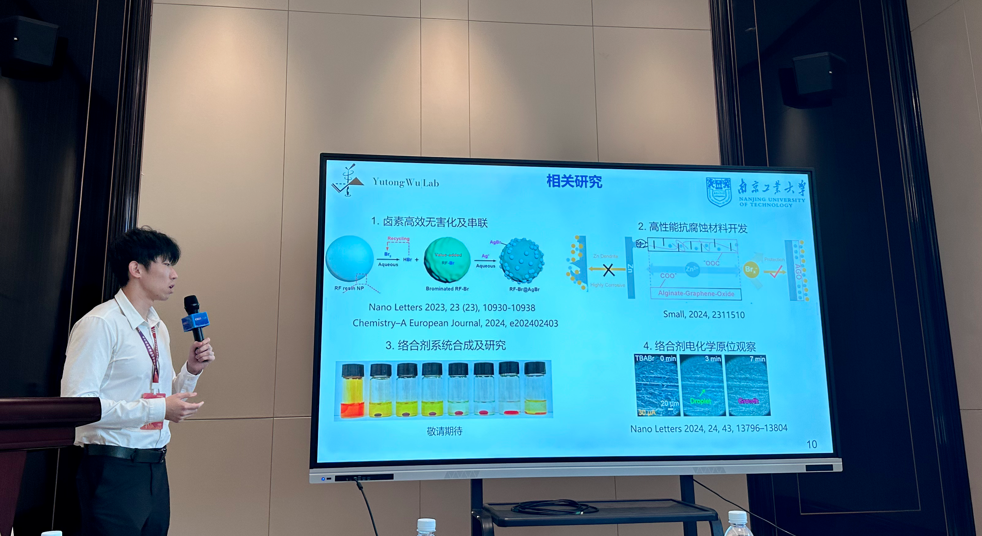 吴博士在第五届国际电化学能源系统大会上作了题为“High-Performance Aqueous|Organic Biphasic Membraneless Zinc-Halogen Battery”的邀请报告。2024年11月