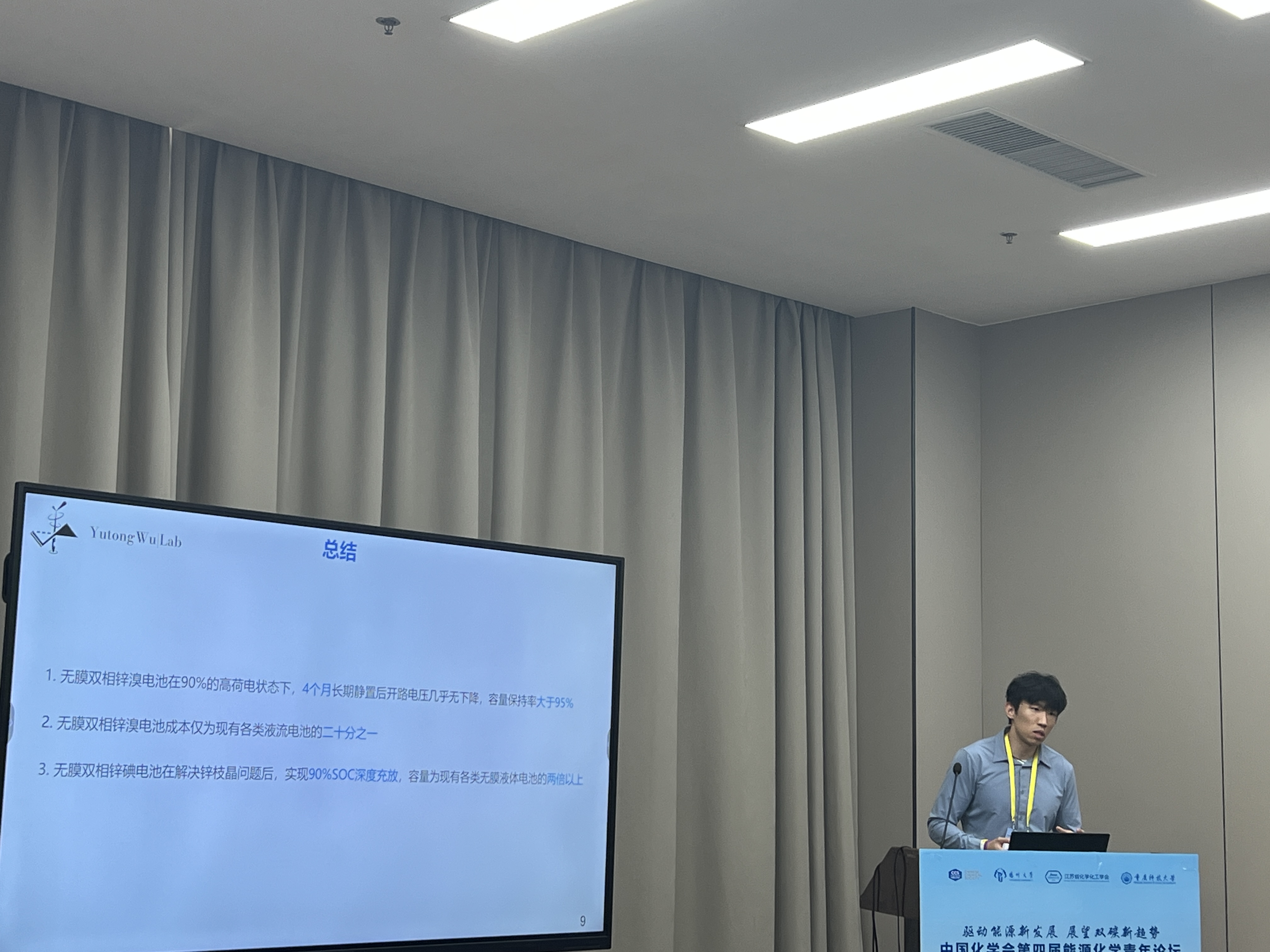 吴博士受邀在第七届国际纳米能源与纳米系统大会和中国化学会第四届能源化学青年论坛作邀请报告,分享了其在双相无膜锌–卤素电池底层设计方面的观点。2025年8月